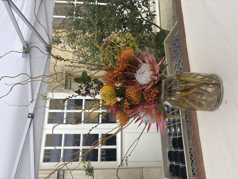 The image displays a large, elaborate floral arrangement set on a white-covered table beneath a white event canopy. The arrangement, housed in a clear glass vase containing water and visible stems, features prominent pink and white Protea flowers, orange and yellow Pincushion Proteas, dark berries, green foliage, green hydrangea-like blooms, and numerous bare, curvilinear branches. Behind the vase, two gray plastic crates are visible; one is labeled "OPTIONS" and contains black circular inserts, while the other holds clear glass items. In the background, a light-colored stone building features tall white French doors with multiple glass panes. To the right of the doors, a dense green bush or small tree grows. The scene depicts an outdoor event or market setup, likely within a courtyard or similar public space in Paris, France. No individuals are present.