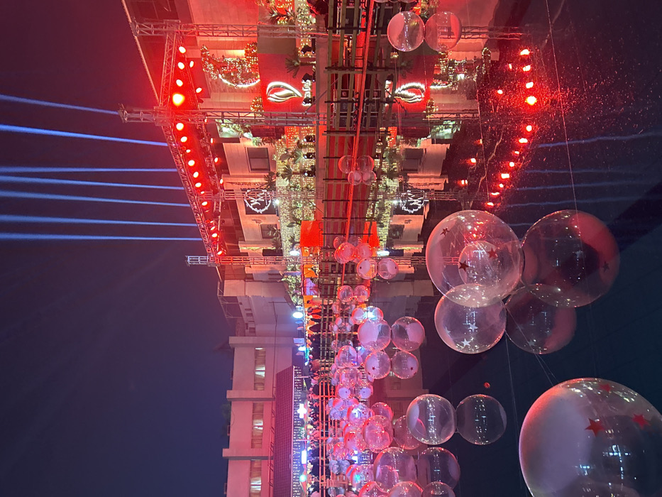 An upside-down building adorned with red lights and decorations is reflected in the foreground. Clear balloons with star motifs are suspended in front of the reflection, creating a layered and visually intriguing scene. Beams of blue light emanate from the top of the image, contrasting with the warm, red tones of the building. The composition is somewhat abstract due to the inversion and reflection.