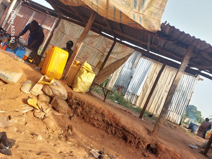 A dilapidated structure with a corrugated metal roof and sides stands amidst a dusty landscape. Cement bags and yellow containers are visible near the shelter's edge. A person is seen working in the background, potentially preparing food or performing tasks near a cooking fire. The scene presents a rustic, possibly impoverished, environment with signs of construction and daily life activities.