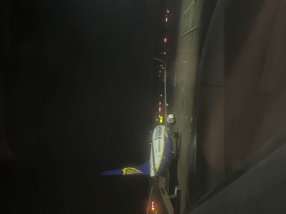 - "A nighttime view from an airplane window shows another Ryanair plane parked on the tarmac" by FM-leUqa2, licensed under CC BY 4.0