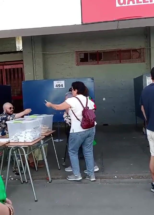 people voting at a polling station. A woman in a white shirt, blue jeans, and a maroon backpack approaches a table where a man sits. She hands him a document. He appears to retrieve something from a clear plastic box on the table. The woman proceeds to a voting booth marked with the number 494. Another woman, wearing a soccer jersey and carrying a small flag, waits behind her. A man in shorts stands to the right. The polling station appears to be located outside a building with a sign. The lighting is bright, suggesting it's daytime.