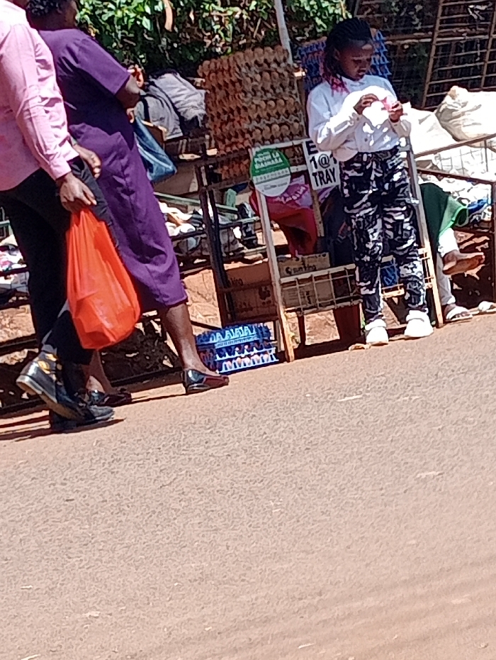 This image depicts an outdoor market scene in Nyeri, Kenya, on what appears to be a dry, unpaved surface under bright daylight. Three individuals are visible, with parts of a fourth. In the left foreground, a person in a pink long-sleeved shirt, black pants, and black-and-gold sneakers holds an orange plastic shopping bag. Immediately to their right is an individual wearing a knee-length purple dress or tunic and silver high-heeled shoes, standing facing away from the viewer. Central to the image is a metal-framed market stall, heavily laden with merchandise. Multiple stacks of brown eggs in cardboard trays are prominent on the left side of the stall. Below the eggs, a green circular sign is affixed, partially legible as "POCHI LA MAANA" and featuring a logo. Another sign displays "1@1 TRAY." Stacked blue plastic crates are visible at the base of the stall. To the right of the stall, a young girl with dark braided hair and pink highlights stands, looking down at a small pink object in her hands. She wears a white long-sleeved top, black-and-white patterned trousers, and white sneakers. In the background, behind the girl, another person's lower legs and feet in light-colored sandals are visible near what appears to be an additional stall or merchandise, including white sacks. Green foliage is present in the upper background, indicating vegetation beyond the immediate market area. The ground surface is a textured, light brown or reddish-brown.