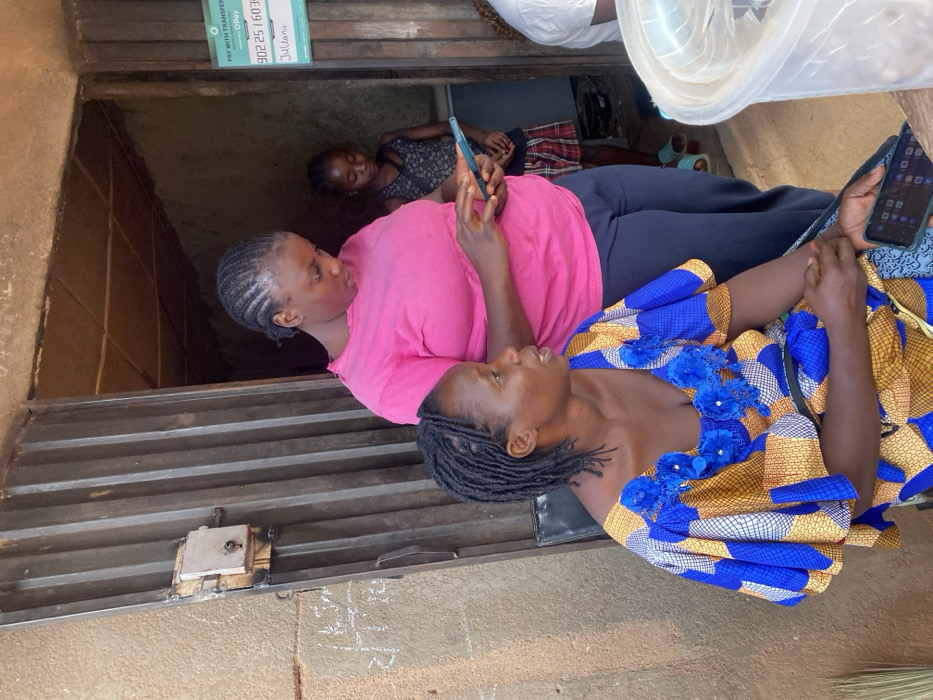 Two women are seated, each holding a smartphone. The woman in the foreground is wearing a brightly colored blue and yellow patterned top with blue flower embellishments. The second woman is wearing a pink top. In the background, a child is lying down and looking at a mobile phone. They are all positioned in front of a closed, barred window, with a sign visible above it. The ground and wall surrounding the window have a weathered, earthen appearance.