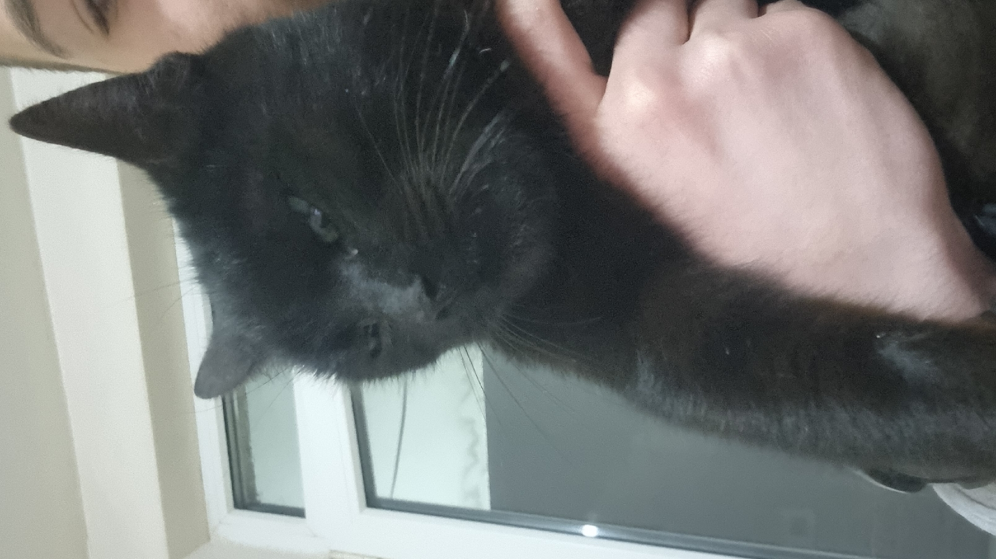 The image captures an indoor scene in Pchelnik, Bulgaria. A black domestic cat is being held by an individual whose hand is visible supporting the cat. The cat, presenting solid black fur and prominent whiskers, has its eyes partially closed or squinted, with a visible tear discharge near the inner corner of its right eye. A portion of the individual's face, including an eye, eyebrow, and forehead, is discernible in the upper right. The background features a white window frame with glass panes, reflecting ambient light, set against a plain white wall or ceiling.