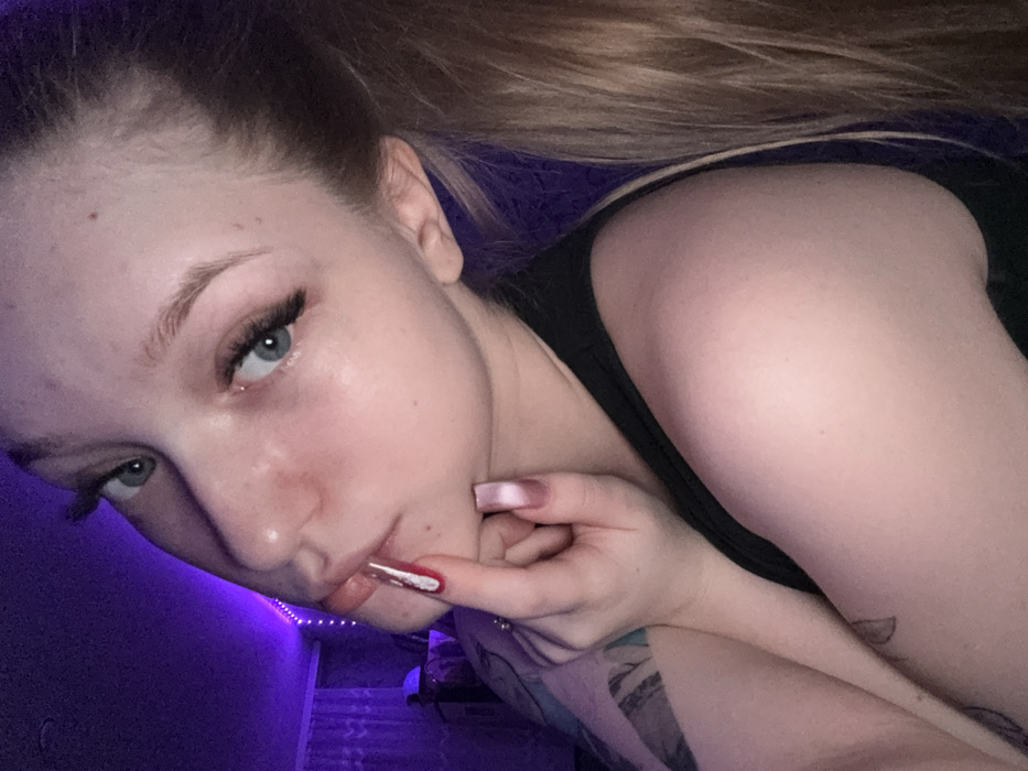 A close-up, high-angle self-portrait features a young adult female in an indoor setting. The individual has light skin, blue-green eyes, and light brown or blonde hair styled in a ponytail, with some lighter strands visible over her right shoulder. She possesses prominent, dark eyelashes, and her facial skin shows some redness, particularly around the nose and cheeks. Her lips are slightly parted, revealing a glossy texture. She is wearing a dark, possibly black, tank top or camisole. Her left hand (viewer's right) is raised, with the index finger gently touching her lower lip. Her nails are long and manicured; the left index finger has a white tip with a red gradient or design, while other visible nails on that hand (e.g., thumb) show a pink/nude gradient. A tattoo of indistinct design is visible on her left upper arm/shoulder area. The background is dimly lit with a dominant purple hue, emanating from what appear to be LED string lights strung along a wall. On the far left, a light-colored curtain or sheer fabric is visible, along with some vague furniture or objects further back. The overall lighting creates a moody, ambient atmosphere. The specific city of Saratov, Russia, cannot be identified from the visual information provided within the image.