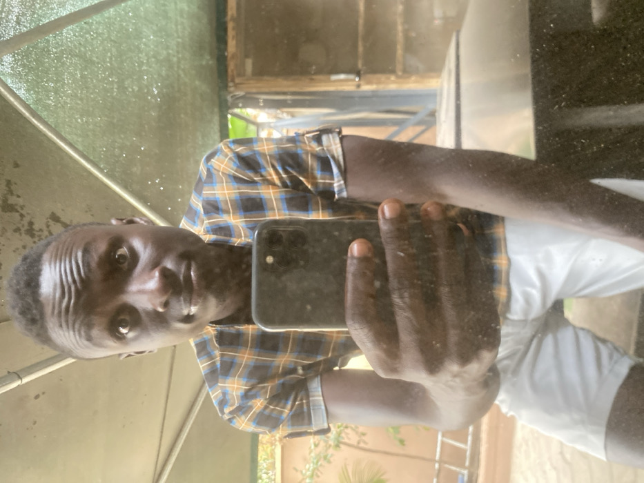A man is taking a selfie in a mirror. He wears a blue and yellow checkered shirt and white shorts. The reflection shows an outdoor setting with plants and a structure with a corrugated roof. His face is visible, with a slight expression. He is holding a smartphone in his right hand. The mirror's surface has some smudges or imperfections.
