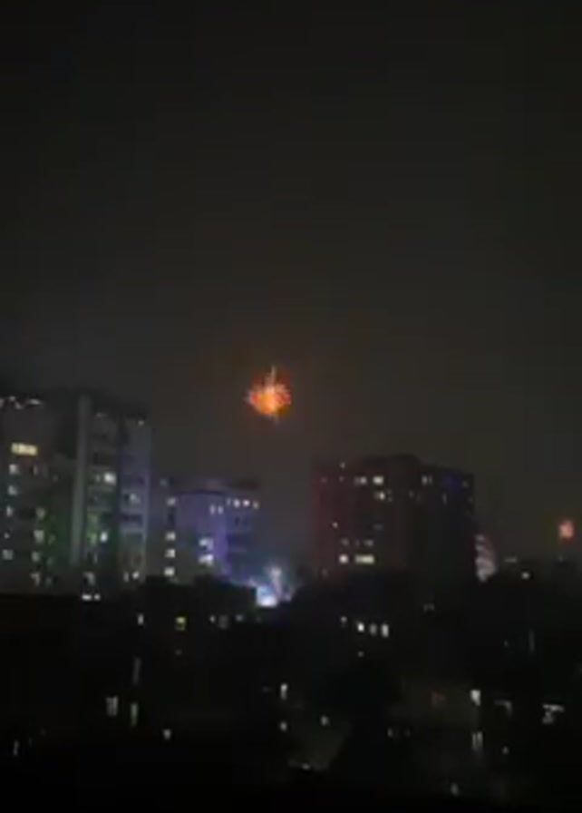 nighttime view of fireworks being set off in an urban area. The camera is positioned at an elevated angle, likely from a building, looking out over several multi-story residential buildings. The buildings are illuminated by lights from within, creating a patterned effect across their facades. The sky is dark, and the fireworks are a prominent source of light. The fireworks explode in the sky, creating bursts of bright sparks. The smoke from the explosions lingers in the air. The video captures the visual spectacle of fireworks in a city environment.