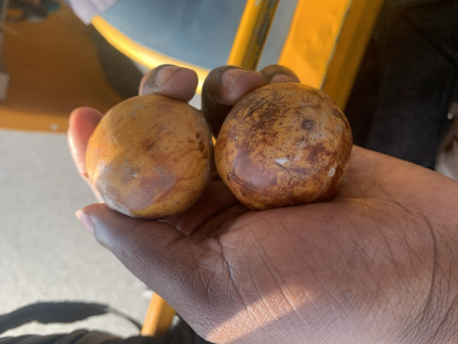 A dark-skinned hand, likely belonging to an adult, is depicted holding two spherical, fruit-like objects in the city of Barakin Lerawi, Nigeria. The objects, approximately 5-7 cm in diameter, exhibit a mottled reddish-brown and yellowish-orange skin coloration, with various lighter, irregular patches. The upper object is held between the thumb and index finger, while the lower object rests on the palm and other fingers. The background is out of focus, revealing bright yellow structural elements, possibly part of a vehicle, alongside blurred darker and lighter areas. Natural daylight illuminates the scene, casting a shadow from the objects and fingers onto the hand's palm.