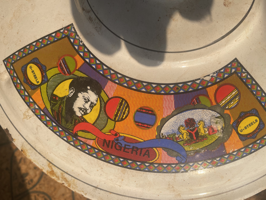 This image depicts a worn, white enameled metal basin or tray, partially seen from a top-down perspective, positioned on a patterned surface, likely flooring, in the city of Isiamigbo, Nigeria. The basin features a decorative, curved decal band with a complex design. The decal includes a black and white stylized portrait of a man with dark hair and a beard, possibly wearing a military cap, set against a yellow background. A red banner displays the word "NIGERIA" vertically in white capital letters. Multiple circular and oval emblems are present, including one prominently labeled "U-STEELS" in yellow text on a blue background. Another oval graphic shows what appears to be a stylized coat of arms with a lion and other symbols. The background of the decal band consists of wavy orange and purple patterns, bordered by a repeating diamond motif in red, green, and blue. The basin exhibits minor rust along its outer edge, particularly at the upper left. Strong natural light illuminates the scene, casting a large, indistinct shadow across the inner right portion of the basin's white surface. No individuals are directly visible, but the depicted portrait represents a person.
