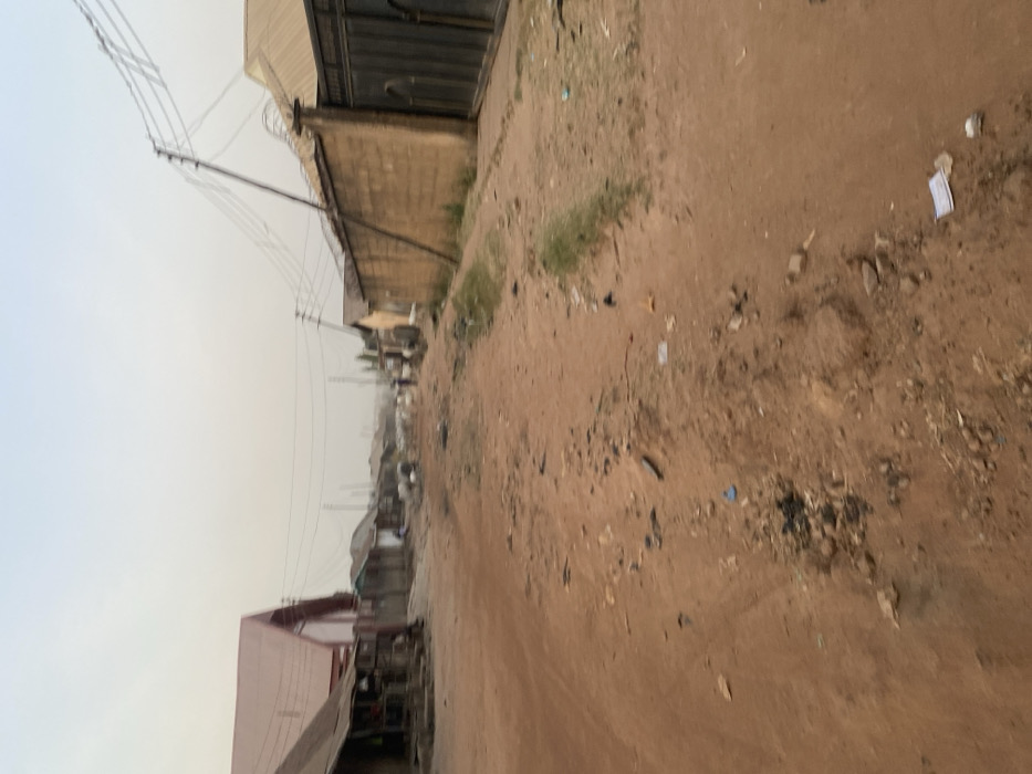 This image depicts an unpaved, reddish-brown dirt road in Sabon Gari Nassarawa, Nigeria, under a hazy, light-colored sky