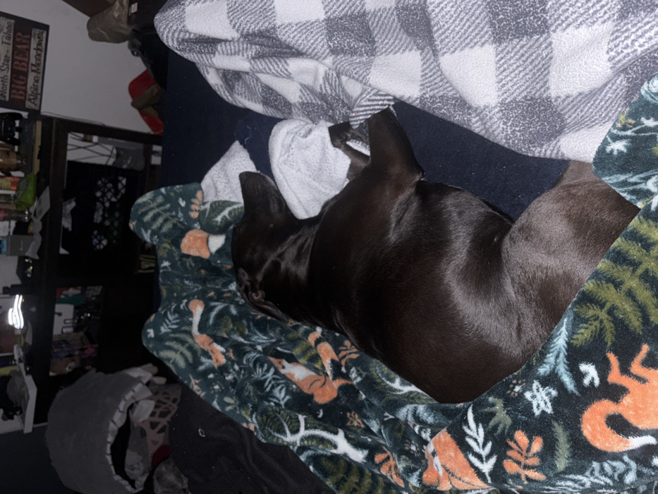 The image depicts an indoor scene within a residence in Coronado, United States of America. A dark-colored, short-haired dog is shown resting on its right side, facing towards the right frame edge. Its head is positioned on a crumpled white towel or small white blanket. The dog's body is partially covered by two blankets: a teal-green blanket featuring an orange fox and evergreen foliage pattern on the left, and a grey and white plaid blanket on the right. A dark blue fabric, likely a bed sheet or additional blanket, is visible beneath the dog. In the background, a dark wooden or metal piece of furniture, possibly a dresser or shelving unit, is positioned against a wall. Numerous small objects, including bottles and reflective items, are arranged on top of this furniture. To the upper left, a grey, soft-sided basket or pet bed is partially visible. A decorative wooden sign is mounted on the wall above the furniture, displaying text including "North Star - Tahoe," "BIG BEAR," and "Alpine Meadows." A red slipper or shoe and a brown object are partially visible on a lower surface to the far right. The overall lighting of the scene is dim. No human individuals are present.