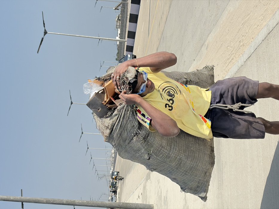 A young male individual walks along a paved sidewalk bordering a multi-lane highway in Alaguntan, Nigeria. He is shown mid-stride, leaning forward under the weight of a large, heavily-laden, torn grey sack resting on his back and left shoulder, filled with assorted refuse including cardboard and plastic. He wears a yellow short-sleeved t-shirt with a "360" logo, dark grey athletic shorts, and blue-tinted swimming goggles pushed onto his forehead. His hands are positioned near the top of the sack, appearing to adjust the load. In the background, a long, wide road extends into the distance, lined with numerous tall, modern streetlights featuring triangular fixtures. Sparse vehicle traffic, including cars and a motorcycle, is visible on the road. The sky is clear and light blue. Shadows are sharp on the concrete surface, indicating bright daylight. Distant, indistinct structures are visible on the horizon to the far right.