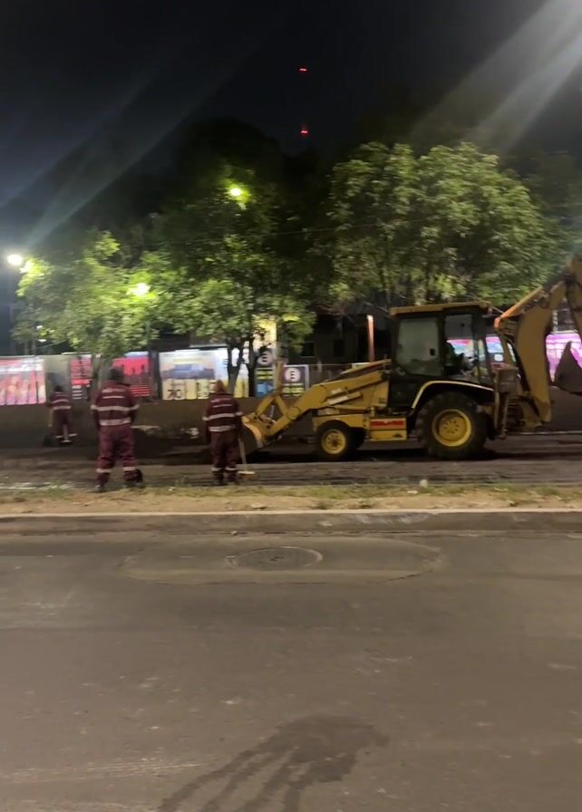 night scene on a city street. Three workers wearing red and white striped uniforms are standing near the curb with brooms. A yellow backhoe sits partially on the sidewalk and partially on the street. Streetlights illuminate the area, and there are trees and poster displays along the sidewalk. The street itself is paved with asphalt and has some visible wear and tear. A tall tower is visible in the distance.
