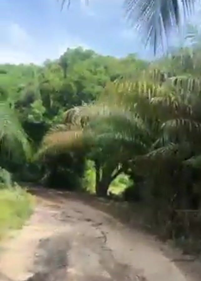 The camera moves along a rutted dirt road flanked by lush green foliage, including palm trees and other dense vegetation