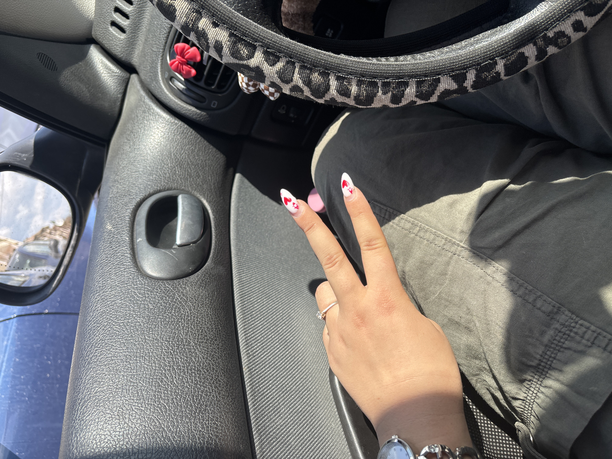 person sitting in the driver's seat of a car. The steering wheel has a leopard print cover. The person is wearing khaki pants and a watch. They are holding up two fingers in a peace sign. Their nails are painted white with a red heart design. The interior of the car is gray. The location is not discernable from the image, and therefore cannot be said to be in Banya, Bulgaria.
