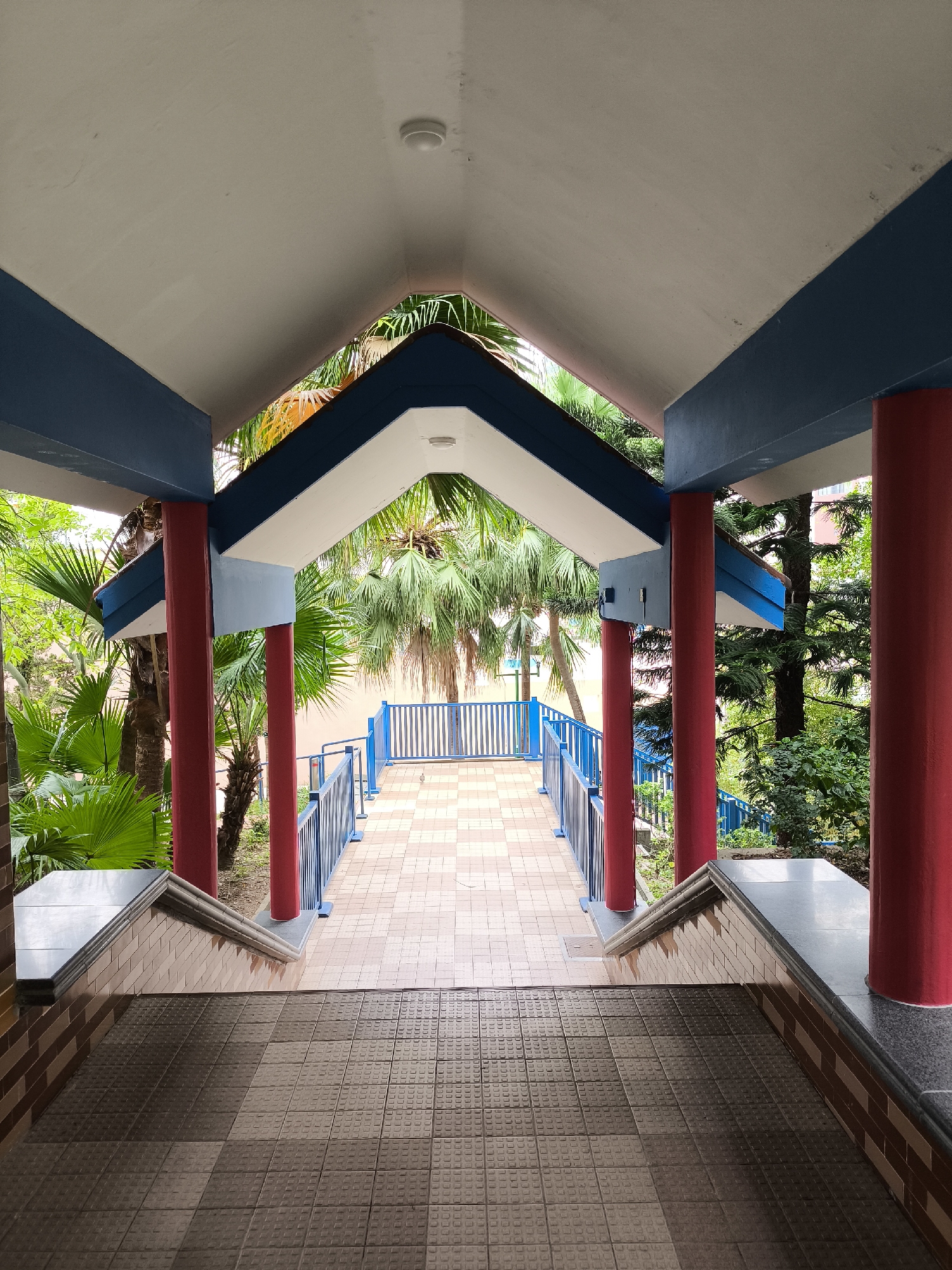covered walkway or bridge, likely in an outdoor public space. The walkway has a roof supported by red pillars. The roof is painted in shades of blue and white. The floor of the walkway is paved with square tiles. At the end of the walkway is a blue metal gate and railing. Beyond the gate, there are trees and greenery, suggesting a park or garden. The image appears to be taken from a slightly elevated position, looking down the walkway. Based on the architectural style (red pillars and blue roofing), this could be in Hong Kong, China. However, without additional context, the precise location in the city is impossible to determine.