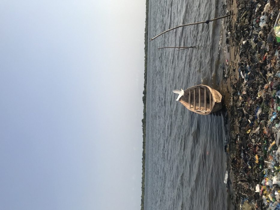 - "A small wooden boat sits in murky water beside a polluted shoreline littered with trash" by FM-DgBfl2, licensed under CC BY 4.0