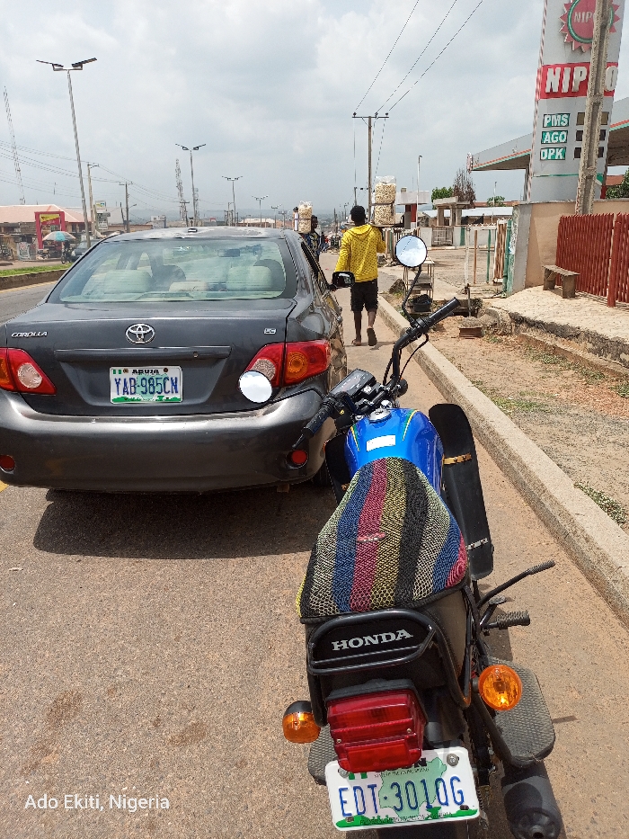 blue Honda motorcycle parked on the side of a paved road, with a black Toyota Corolla car parked in front of it. The motorcycle has a black seat with a colorful mesh pattern, a black and silver frame, and a blue body. The car has a black body, a silver front bumper and a silver trim along the bottom of the body. The car has the license plate "YAB-985CN" and the word "COROLLA" is visible in the lower left corner. The motorcycle has the license plate "EDT-301OG". The motorcycle is in the foreground of the image, while the car is in the background. The scene is set on a road in Ado Ekiti, Nigeria, at coordinates (latitude: 7.651, longitude: 5.227). The road has a sidewalk on the right side, with a grassy area and a sign for "NIPCO" in the background. A few people are walking on the sidewalk. The sky is mostly clear with white clouds. The environment is relatively clean and well-maintained.