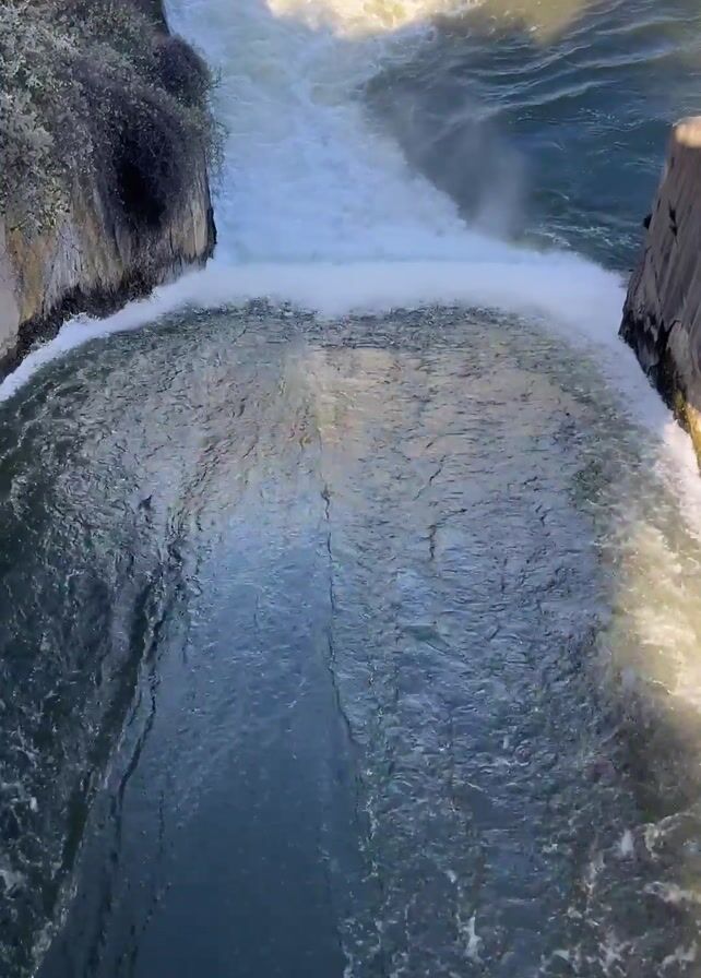 top-down view of water flowing through a dam structure. Water flows from a higher level, creating a white foamy effect as it drops down, and transitions into a more contained body of water. Concrete structures flank both sides of the water flow, and a small bush grows on one side. The water’s surface exhibits ripples and shadows from the sun, creating a reflective pattern.