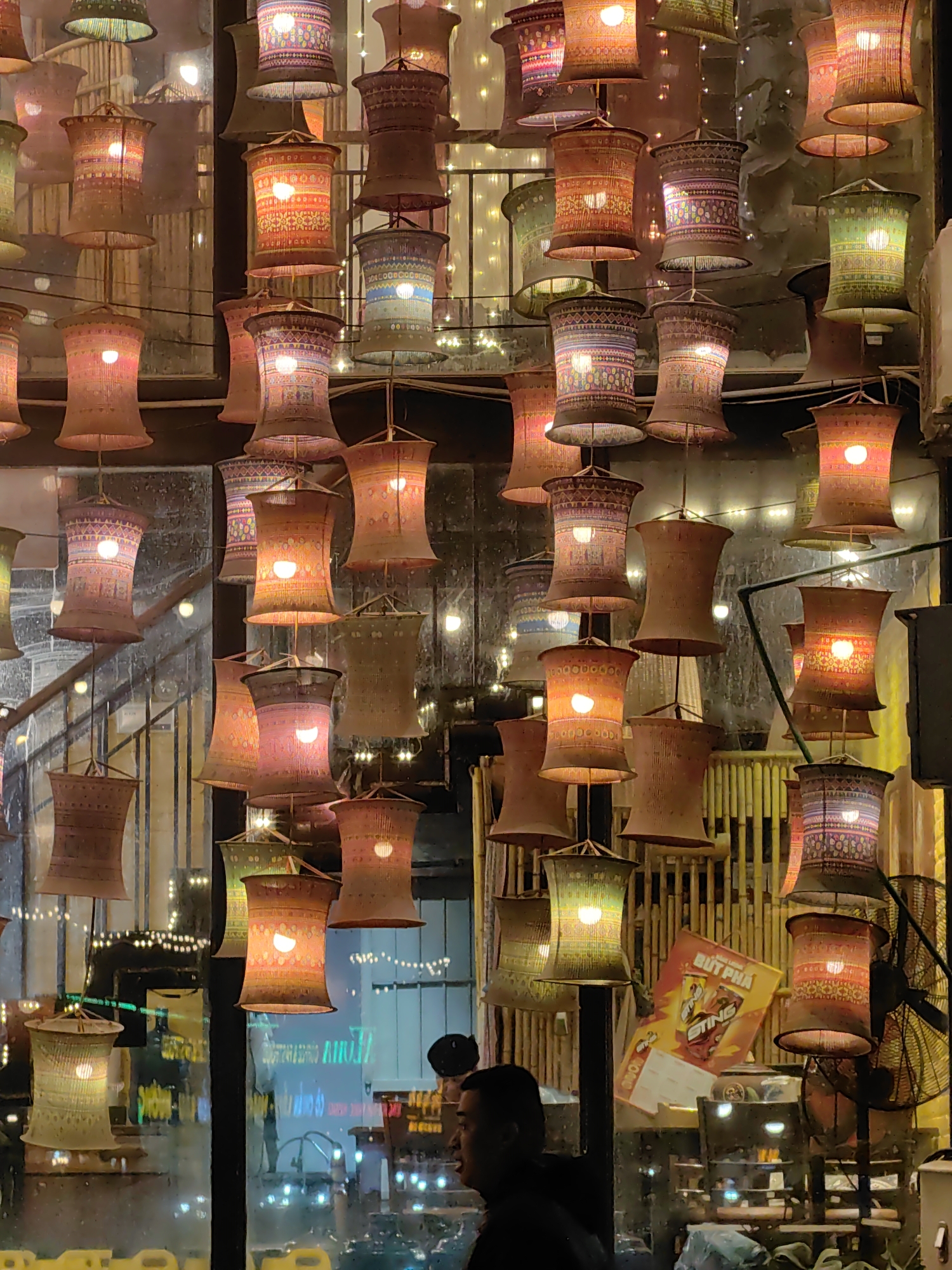 This image displays the interior of a commercial establishment, likely a cafe or restaurant, situated in Sa Pa, Vietnam, observed at night. The scene is dominated by a dense arrangement of approximately 30-40 traditional lanterns, suspended at varying heights from an unseen ceiling structure. These lanterns are predominantly cylindrical or bell-shaped, crafted from woven materials like rattan or bamboo, and feature intricate patterns in various colors, including red, orange, green, blue, and purple. Each lantern emits a warm, diffused light from an internal bulb. In the lower right foreground, the silhouette of an adult male with short dark hair is visible from the chest up, facing towards the right. Behind the array of lanterns, reflections on a large glass surface reveal blurred exterior lights. Visible interior background elements include a wall constructed of vertical bamboo slats, a metal staircase railing in the upper left, and indistinct outlines of tables and chairs. A string of small white fairy lights is strung across the upper background. On the right, a red and yellow poster featuring the Vietnamese text "BÚT PHÁ" and "STING" is partially visible, alongside a black industrial-style fan.