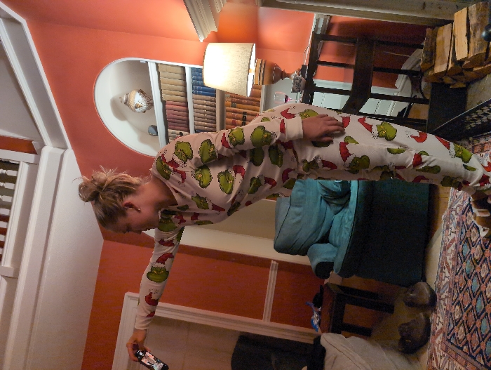 A woman in Grinch-themed pajamas takes a selfie with her phone