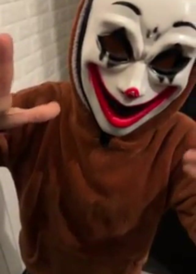 A person wearing a brown hooded sweatshirt and blue jeans is standing indoors, posing in front of a white brick-like wall. The person is wearing a white clown mask with black eye makeup and a red nose and lips. They hold their hands up, fingers spread, then bring them down to their sides. The lighting is dim, and a black curtain is visible in the background.