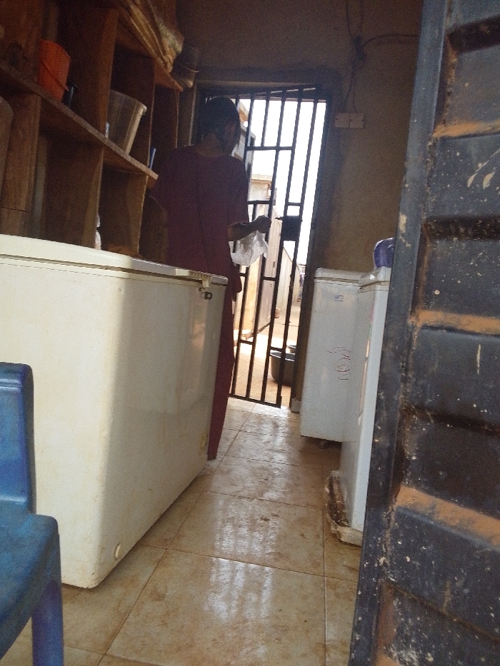 The scene is an interior view of a commercial or storage space in Ankpa, Nigeria, characterized by utilitarian fixtures and natural light. One individual, observed from behind, stands centrally in a dark red long-sleeved garment, holding a clear plastic bag in the right hand. To the left, a large, off-white chest freezer is positioned horizontally. Partially visible in the extreme lower-left foreground is a blue plastic chair. Behind the chest freezer and to the left, a wooden shelving unit contains an orange bucket and clear plastic containers. To the right of the scene, a smaller, white upright freezer or refrigerator stands. The floor is covered with light brown square tiles, exhibiting reflective patches, possibly indicating dampness. An open doorway, fitted with a dark vertical metal security gate, is visible in the background, allowing daylight to illuminate the area and revealing an exterior dirt path and distant structures. A dark basin or container is discernible on the ground outside the gate. A dark, textured door frame or panel is partially visible on the extreme right foreground. The walls are light brown. The individual appears to be interacting with the contents of the plastic bag while positioned between the chest freezer and the open doorway.