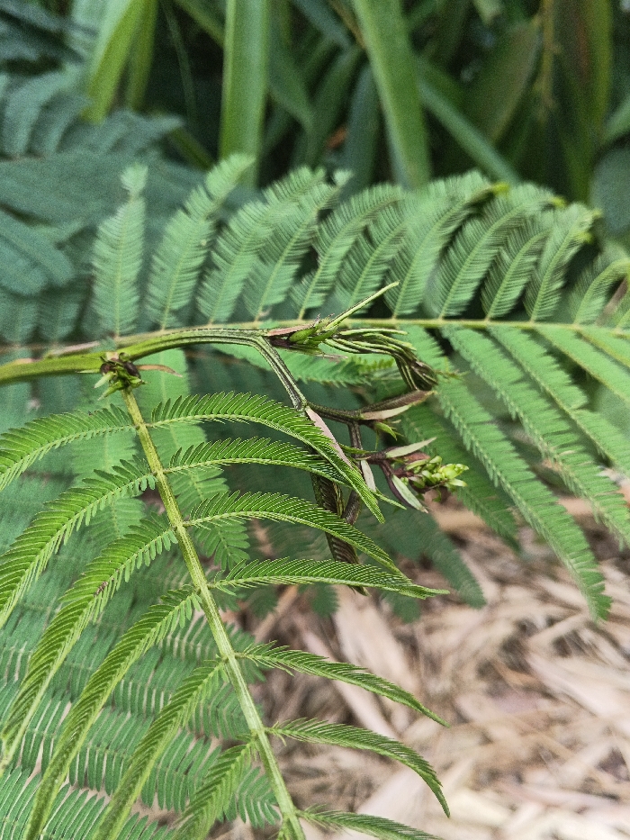 The image presents a close-up view of vibrant green plant foliage, located in Butwal, Nepal. The central subject is a detailed compound leaf, characterized by a central rachis from which multiple pairs of pinnae branch, each bearing numerous small, oblong leaflets. The overall leaf structure appears bipinnate. Near the stem's apex and nodes, several nascent growths are visible; these are tightly furled, lighter green shoots, some displaying faint reddish-brown tints at their edges. The background is softly blurred, revealing additional green foliage and, in the lower right quadrant, indistinct light brown organic material, consistent with dry leaves or plant debris. No individuals, animals, or man-made objects are present in the scene. The lighting suggests natural daylight conditions.