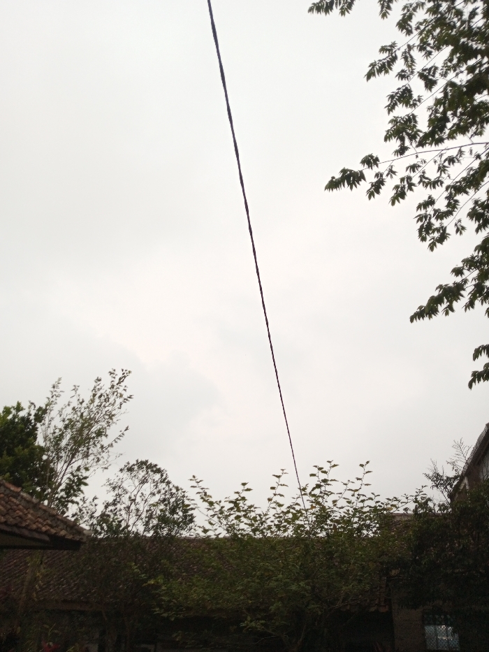 The image depicts an outdoor scene under an overcast, light gray sky. A single dark wire extends diagonally across the upper central portion of the frame, from the upper left to the lower right. Foliage is visible on all sides of the lower frame, with dense dark green leaves from a tree branch entering the frame from the upper right. In the lower left, a section of a terracotta-tiled roof is present, with a visible overhang. Below the wire and extending horizontally across the mid-ground is a more distant roofline, also appearing to be tiled, largely obscured by various green bushes and trees. Towards the lower right, a portion of a building wall, possibly brick or concrete, is visible behind some foliage. No people are present, and no specific actions or interactions are depicted. The scene is consistent with a residential or semi-rural area within Ivato, Madagascar, though no precise location markers within the city are identifiable from the image content.