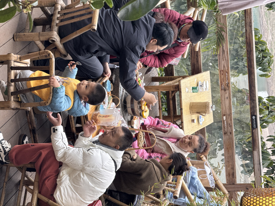 A group sits around a bamboo table. A man in a black suit serves food from a wooden container. A child in a yellow and blue jacket sits on a bamboo chair, reaching towards the food. An older man in a white jacket raises his hand. Other people are seated around the table, wearing various colors of clothing. They are in a restaurant with a view of water and foliage.