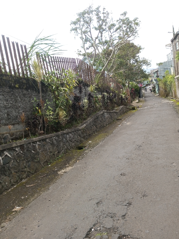 A narrow asphalt road stretches uphill, lined by a stone wall and lush greenery. A rusty fence tops the wall, interspersed with plants. Buildings are visible on the right side of the road, receding into the distance. The road surface is worn and cracked. The sky is overcast.