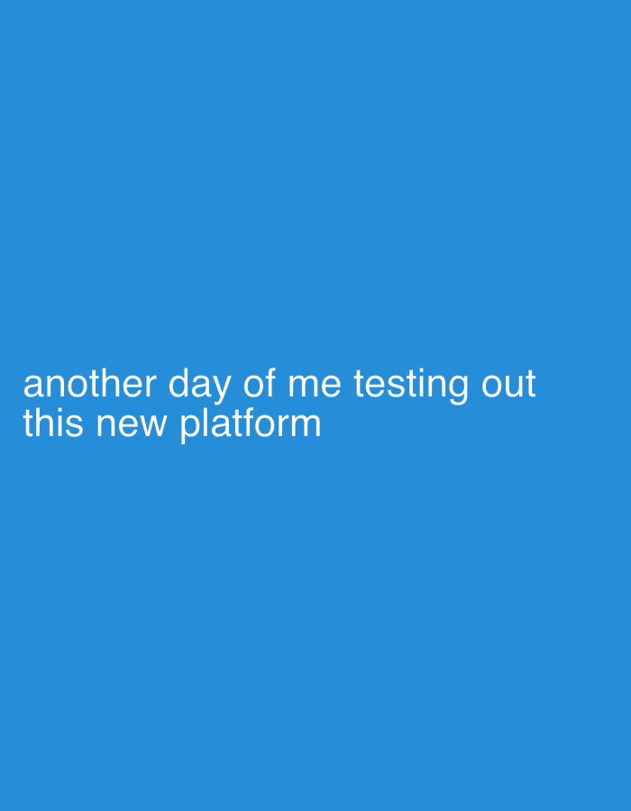 The image displays a solid blue background, approximately #1E90FF in color, filling the entire frame. Centered in the lower-left quadrant of the frame is white sans-serif text. The text reads: "another day of me testing out this new platform". No people, subjects, objects, actions, or interactions are visible. The environment depicted is abstract, consisting solely of a colored background and text. No geographical location, including any specific area within Hà Nội, Vietnam, can be identified or inferred from the visual content of this image.