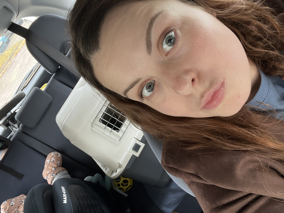 An adult female is depicted taking a selfie inside a vehicle, located in Meisenheim, Germany. Her head and upper torso occupy the foreground, displaying long brown hair, wide green eyes, and pursed lips. She wears a brown jacket over a light blue waffle-knit top. In the background, an infant's arm and leg, dressed in a light-colored garment with a penguin pattern, are visible within a black Maxi-Cosi car seat. A two-tone light beige and grey plastic pet carrier with a metal grid door rests on the seat next to the car seat. A yellow spherical toy is partially visible near the infant's feet. Through the rear window, a blurred outdoor environment with autumnal foliage and a distant blue vehicle is discernible under what appears to be overcast conditions.