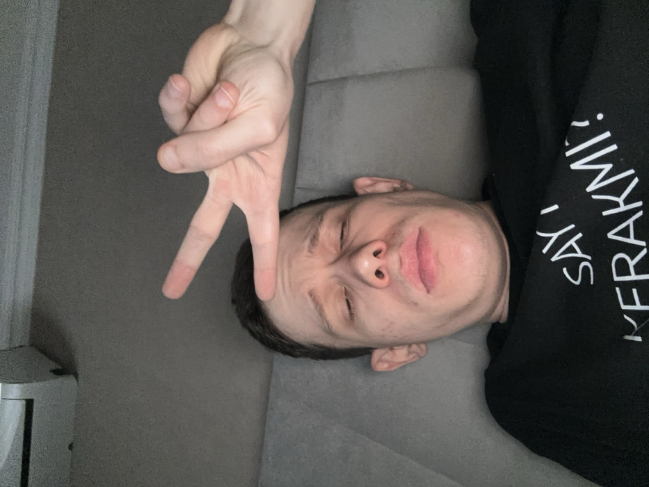 The image depicts a single male individual in an indoor setting. The specific location within Tashkent, Uzbekistan, cannot be determined from the visual information provided. The subject is observed from an elevated perspective, lying on a grey upholstered surface, possibly a couch or bed. He has closed eyes, slightly parted lips, and short, dark hair. He is wearing a dark-colored long-sleeved shirt or sweatshirt with partially visible white text on the chest that reads "SAY I KERAKMI?". His right hand is raised above his forehead, forming a V-sign with the index and middle fingers extended. A light-colored architectural fixture or trim is visible in the upper left background of the frame.