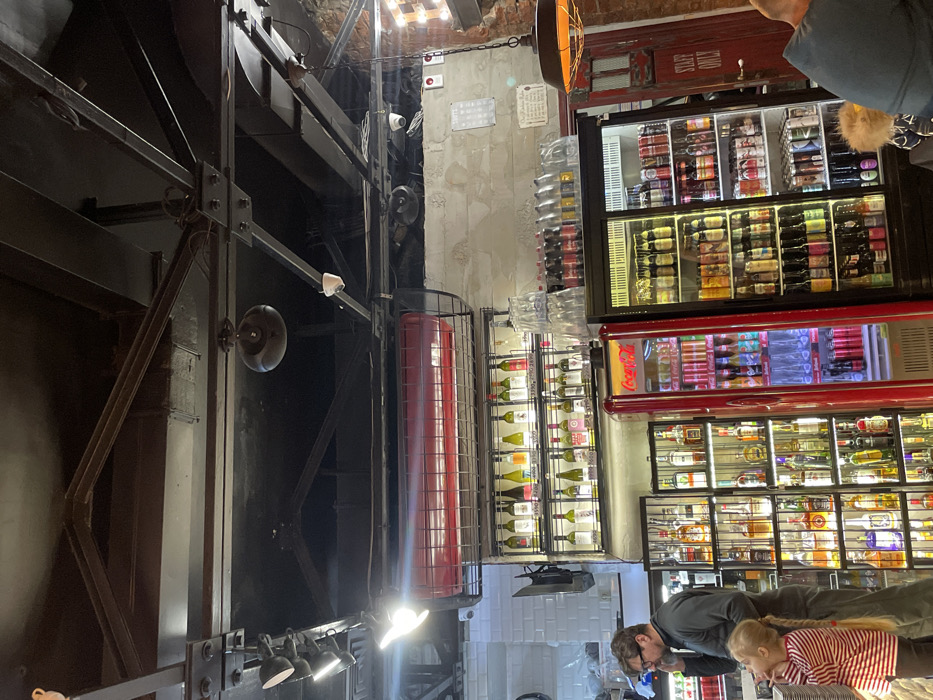 The image depicts the interior of a commercial establishment, likely a bar or restaurant, located in Moscow, Russia. The scene captures a multi-level view, focusing on beverage displays and a few individuals. The ceiling features exposed dark metal beams, piping, and wiring, indicative of an industrial design aesthetic. Multiple lighting fixtures, including track lights, recessed lights, and at least one red radiant heater with a protective cage, illuminate the space. Several security cameras are mounted on the ceiling structure. Mid-ground shows various beverage displays. On the left, two vertical illuminated shelves showcase numerous bottles of spirits. Above these, two horizontal shelves display wine bottles, also backlit, with small price tags visible (e.g., "3390", "3990"). Centrally, two large glass-fronted refrigerated coolers are present: a red Coca-Cola branded cooler filled with soft drinks, and an adjacent multi-door cooler stocked with various bottled and canned beers and other beverages. A stack of clear plastic cups rests atop the right cooler, next to rows of bottled drinks. The wall behind the coolers transitions from white tiles on the left to a light grey concrete or plaster surface on the right, where a small, partially obscured sign is affixed. To the far right, a section of exposed reddish-brown brick wall is visible, along with a dark wooden door marked "STAFF ONLY" in white text. In the foreground on the left, an adult male stands, facing slightly right. He wears a dark grey long-sleeved shirt and glasses, and has a beard. He holds a black smartphone to his right ear, engaged in a conversation. In front of him stands a young girl with long blonde hair tied in a braid, wearing a red and white striped long-sleeved shirt, looking upwards and to her left. In the lower right corner, the back of a seated person's head and right shoulder are visible, clad in a dark blue garment with a light-colored fur or wool collar.