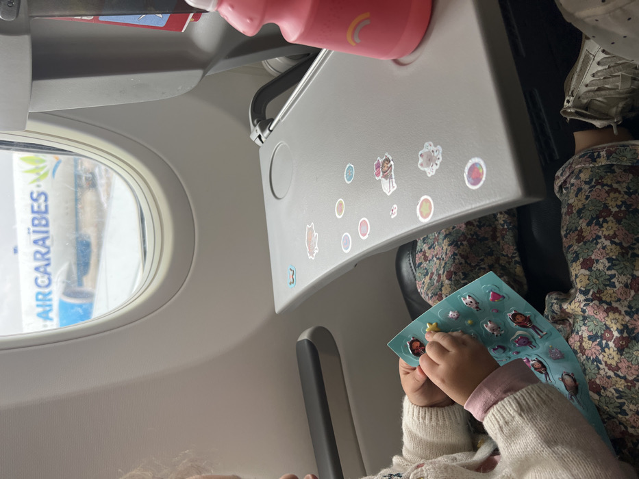 The image displays the interior of a commercial aircraft cabin, viewed from an adjacent seat. A young child is partially visible on the left, seated. The child wears a light-colored knitted sweater over a pink long-sleeved shirt and dark floral-patterned trousers. Their hands are actively peeling a yellow star-shaped sticker from a light blue sheet containing various cartoon-style stickers, some depicting aquatic creatures. In front of the child, a grey airplane tray table is in the lowered position, its surface covered with approximately a dozen colorful, circular, and irregular-shaped stickers. To the right side of the tray table, a pink plastic water bottle, featuring a small rainbow sticker, rests upright. A portion of a black armrest is visible to the left. Through the circular aircraft window, the fuselage and a section of the wing of another commercial aircraft are visible on what appears to be an airport tarmac. The name "AIR CARAÏBES" is clearly legible in blue capital letters on the white fuselage of the aircraft outside. The scene is located at Paris Orly Airport (ORY) in Paray-Vieille-Poste, France.