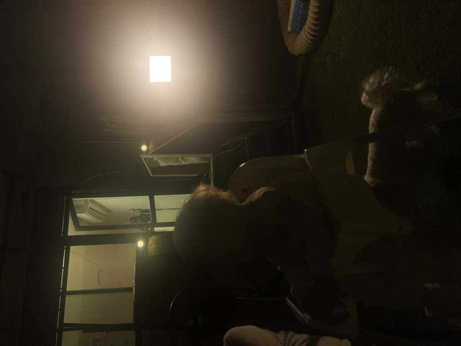 The image depicts a nighttime outdoor scene in Kiryat Yam, Israel, illuminated by artificial light sources. In the foreground, a silhouetted individual, appearing to be an infant or young child, is seated in a white high chair. Partially visible to the immediate left is a segment of another person's arm or shoulder. Beneath and slightly to the right of the high chair, a small, light-colored dog stands on artificial turf, facing towards the right. The background features a residential structure with large windows and a glass door. Through the glass, an interior room is dimly visible, containing an air conditioning unit mounted on a wall. To the right of the building, a dark set of stairs ascends. A bright, rectangular light source emits a strong white glow from the right mid-ground, obscuring details behind it. Two smaller, circular, yellowish lights are affixed to structures: one above the stairs and another near the window frame. On the far right, resting on the artificial turf, is a braided, circular dog bed containing several blue objects. The ground throughout the visible area is covered with artificial green turf.