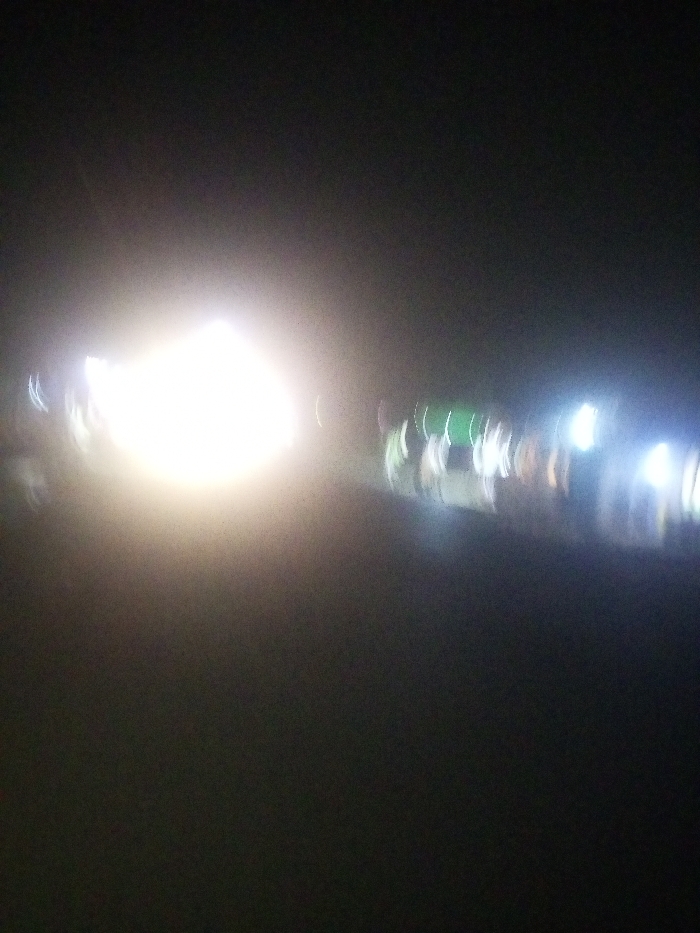 A dark, blurred image shows bright, undefined lights. On the left, an intense, rectangular light source dominates. To the right, a series of less distinct, elongated lights stretch across the frame, showing hints of green and white, suggesting movement. The overwhelming darkness and motion blur create an impression of speed or instability.