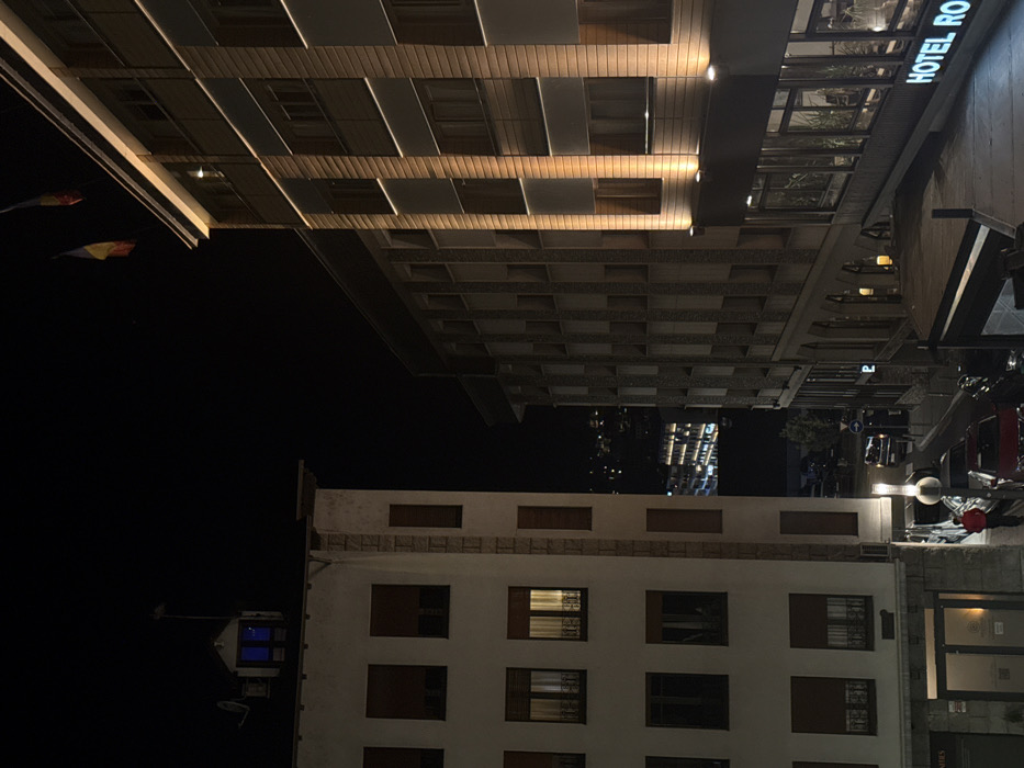 Buildings appear at night, photographed from below. A multi-story building with a checkerboard exterior and 'HOTEL RO' sign hovers over a white building with dark windows. Distant lights are visible between the buildings. Two banners fly on the left side of the upper building. Cars and streetlights dot the foreground.