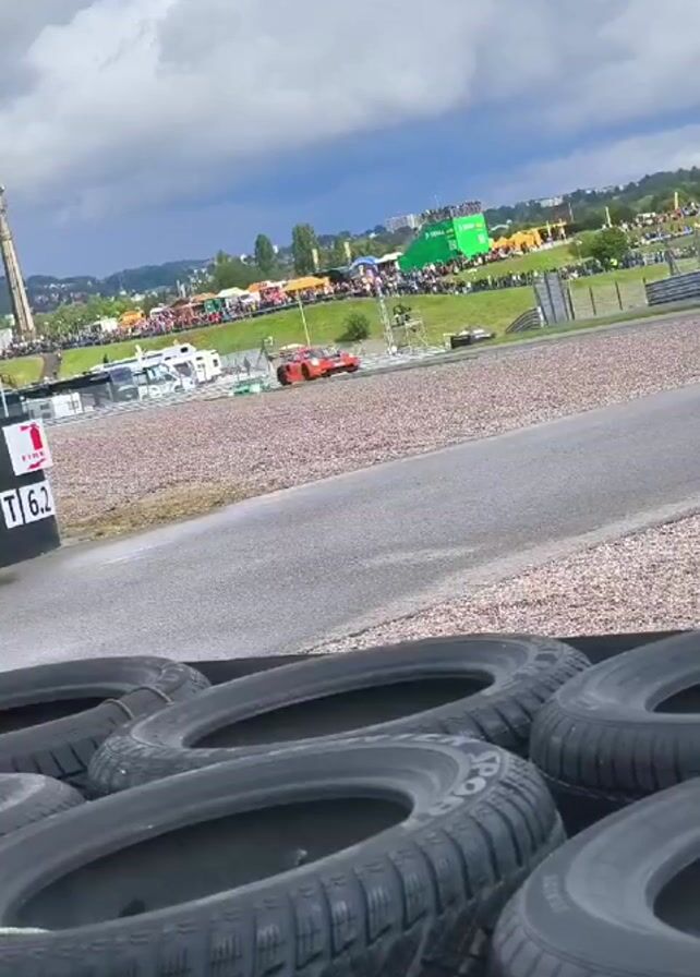 motor race track with a barrier of tires in the foreground. Cars race past on the track, including an orange car and a green car. In the background, there's a crowd of people, buildings, and tents. The sky is cloudy. A sign with "T 6.2" is visible near the track.