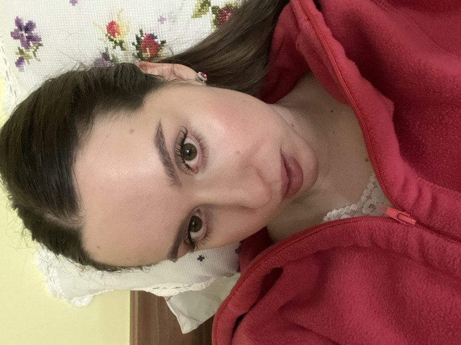 A woman with dark hair, laying on a pillow adorned with cross-stitch flowers, gazes at the camera. She wears a red fleece jacket partially unzipped to reveal a white lace garment underneath. Her fair skin is subtly flushed, and she wears small, possibly gem-studded earrings. The background includes a glimpse of a yellow wall, suggesting an interior setting.