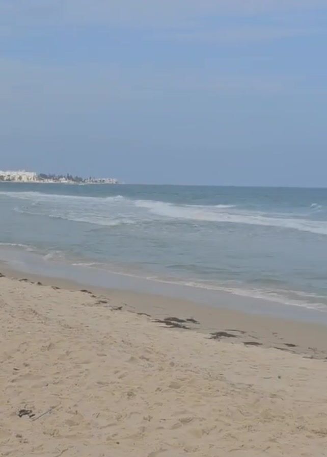 The video depicts a sandy beach meeting the ocean under a blue sky with scattered clouds