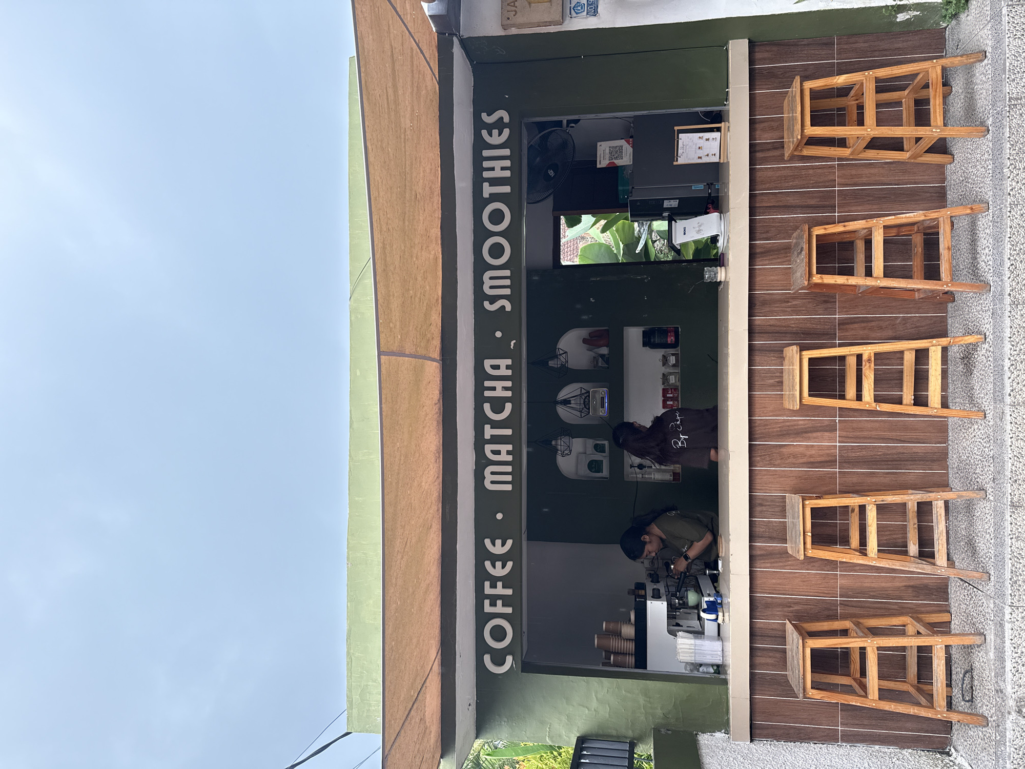 The image depicts a coffee shop, likely in North Kuta, Indonesia, based on its architectural style and surrounding vegetation. The shop's facade is painted in shades of green and brown, with the words "COFFEE • MATCHA • SMOOTHIES" vertically aligned on the building's side. Inside the shop, two people appear to be working behind the counter. One is dressed in a dark shirt and is looking at the coffee machine. The other is standing further back and wearing a long sleeved shirt. The countertop holds coffee cups, containers, and the coffee machine. Several wooden stools are placed along the shop's exterior, resting against a wood-like tiled wall. A glimpse of the sky is visible above, suggesting it's daytime.
