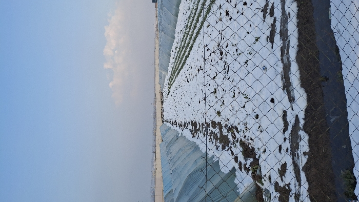 This image depicts a winter agricultural landscape, likely situated on the outskirts or in a peri-urban agricultural zone of Tashkent, Uzbekistan. In the foreground, a dark, metal chain-link fence extends horizontally across the frame, partially covered by snow and revealing dark soil and a narrow, dark channel or ditch immediately below it. The midground features multiple parallel rows of tunnel greenhouses on the left, constructed with a light blue or translucent plastic sheeting covering arched frames. To the right of these greenhouses, an open field is partially covered in white snow, with patches of dark soil visible. Distinct rows of small, green, low-lying crops are discernible emerging from the snow-dusted ground, particularly on the right side of the field. In the background, a low, light-colored wall or structure runs horizontally, separating the field from the distant horizon. The sky is clear and pale blue, with a single, small cluster of white clouds visible near the right horizon. No individuals or active processes are observed in the scene.