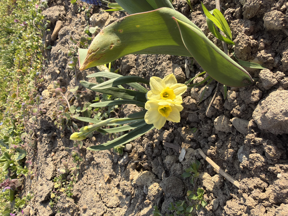 - "The scene, located in a garden in Kilifarevo, Bulgaria, presents a close-up view of flora emerging from dry, brown soil" by FM-mFfAq2, licensed under CC BY 4.0