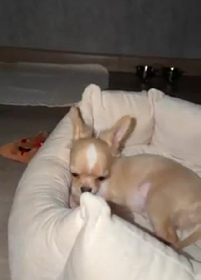 A small Chihuahua puppy is lying in a white dog bed. The puppy is light brown with white markings on its head. It is chewing on a small, brown stick-like treat. In the background are a dog bowl, a pee pad, and a small toy. The dog bed is on a light-colored floor. The lighting is dim.