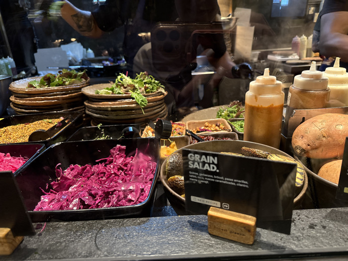 The image displays a food service counter, consistent with a restaurant or deli environment in Madrid, Spain. The perspective is through a glass barrier, reflecting elements from the viewer's side and the background. The immediate foreground consists of a dark, textured countertop. Behind the glass, a variety of food items are presented in a structured display. On the left, a large black rectangular container holds vibrant pinkish-purple shredded cabbage. Adjacent to it, another black container contains a yellowish granular substance, possibly a grain or seed mixture. Further right, multiple smaller compartments contain various toppings and ingredients, including nuts and greens. Centrally, two stacks of round, brown ceramic plates are visible, each with a serving of leafy green salad on top. To the right, several transparent squeeze bottles, containing sauces or dressings of various colors, are arranged alongside whole, unpeeled sweet potatoes. A prominent black rectangular sign, positioned vertically, labels one offering as "GRAIN SALAD" and lists its ingredients in Spanish: "Quinoa, garbanzos, brócoli, pasas amarillas, tomates secos, nueces caramelizadas, cilantro, menta, perejil," also indicating "NEW RECIPE." A small, light-colored wooden block, partially inscribed, rests on the countertop directly in front of this sign. Reflections on the glass barrier reveal a person's arm with visible tattoos on the left side of the frame, and a partial reflection of a device, likely a smartphone, held centrally, suggesting the presence of a person viewing or photographing the display. The background, visible through the reflections and behind the food counter, shows indistinct shapes of kitchen equipment and additional human activity related to food preparation or service.