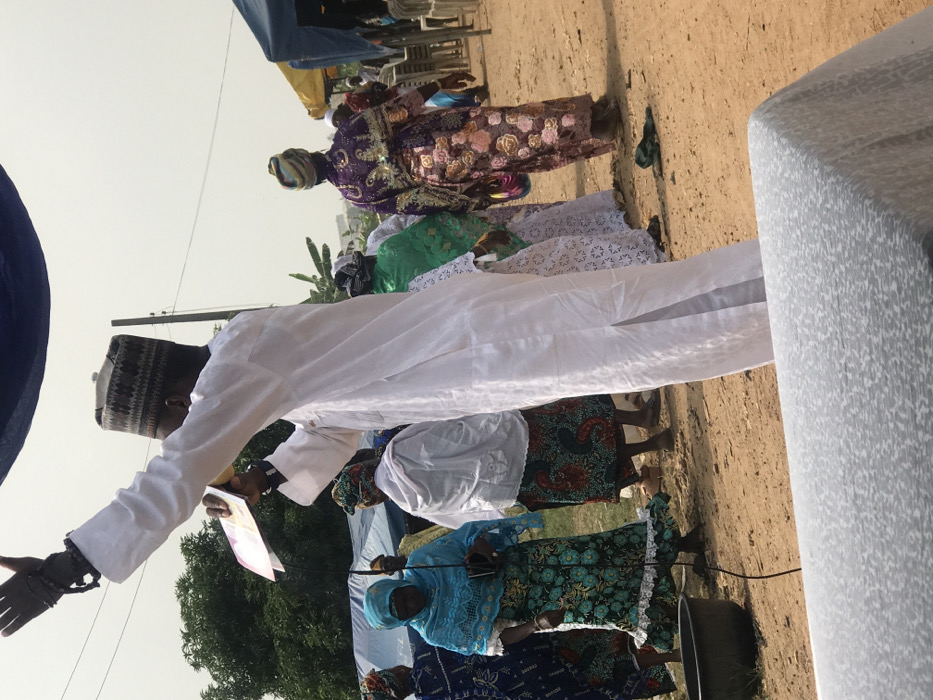 The image depicts an outdoor gathering in Orudu-Olokan, Nigeria, on a clear day, with individuals standing on reddish-brown dirt ground