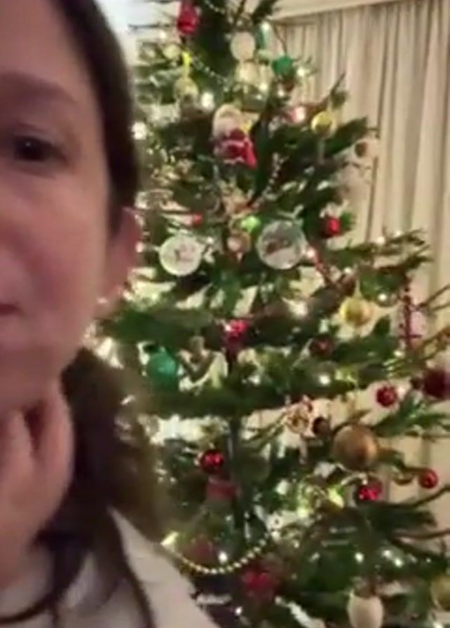 A woman with brown hair is standing in front of a Christmas tree. The tree is decorated with colorful ornaments, lights, and a red bow on top. The woman is looking at the camera with a neutral expression and has her hand on her chin. She is wearing a white shirt. In the background, there are cream-colored curtains. The scene is indoors and appears to be in a home.