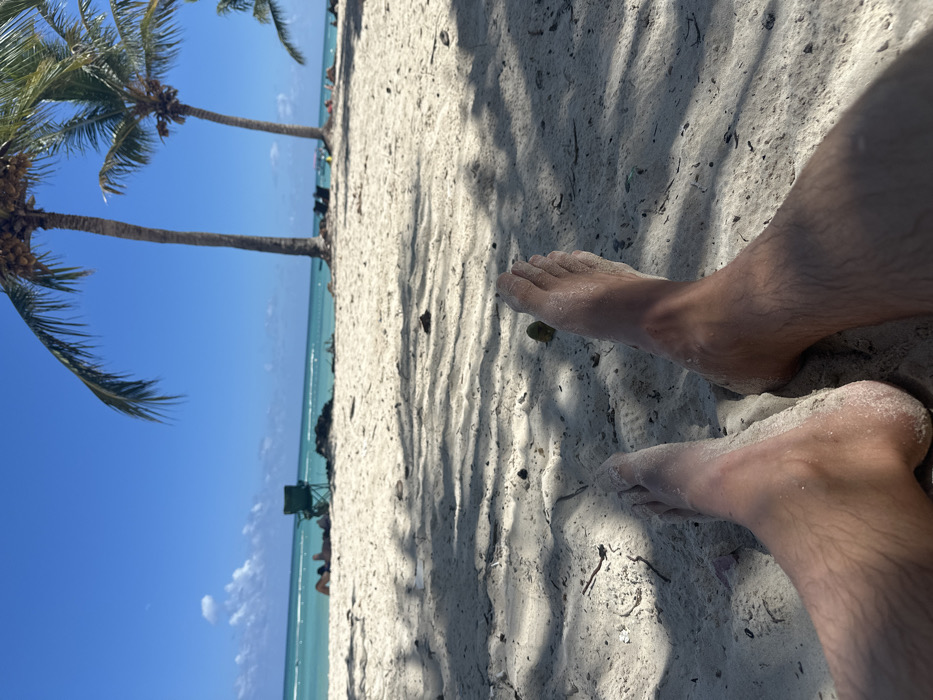 This image depicts a first-person view from a sandy beach in Higüey, Dominican Republic. In the immediate foreground, the bare lower legs and feet of an individual rest on light-colored sand, partially covered by sand particles. Distinct shadows, consistent with palm fronds, are cast across the sand and the limbs. The midground features an expanse of sunlit sand leading towards the ocean. Two prominent palm trees with visible coconuts are situated on the sand, extending upwards. Near the water's edge, a green folding chair is present, along with dark, irregular mounds, consistent with debris or accumulated seaweed. Several indistinct human figures are observed on the distant beach and in the shallow, turquoise ocean water. The background shows the clear, light blue waters of the ocean extending to the horizon, under a sky with minimal, scattered white clouds. A subtle demarcation line, possibly a string of buoys, is visible in the water. Faint shapes of distant watercraft can be discerned on the horizon. The scene is illuminated by bright sunlight, casting sharp shadows.